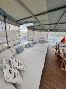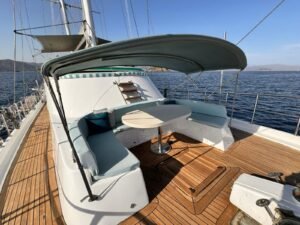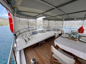 - Diverse Social Zones: The deck layout features an ön loca (forward lounge), a sophisticated flybridge, and an arka loca (aft lounge) located directly over the sea, providing multiple perspectives during your Luxury Gulet Charter Fethiye.