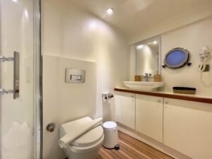 • Private Ensuites: Every cabin is equipped with its own private WC and shower, along with high-end amenities and integrated hair dryers.